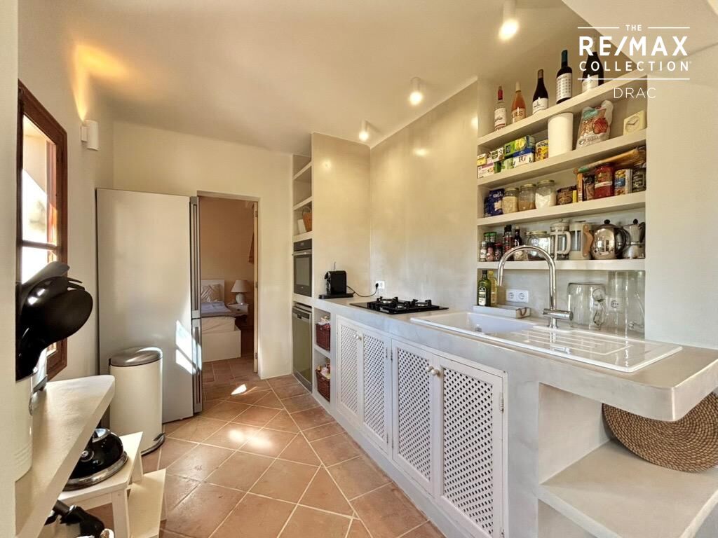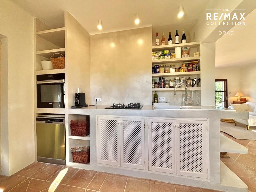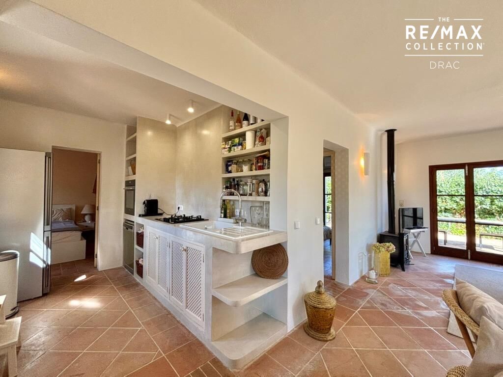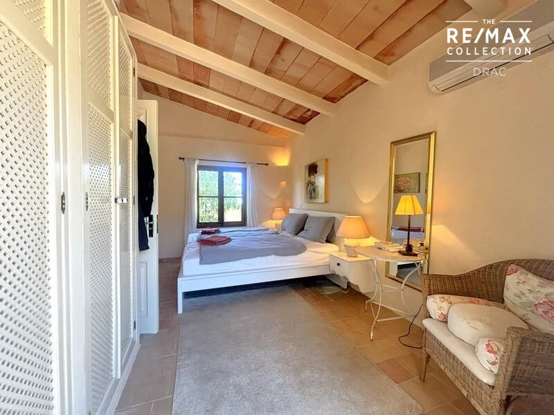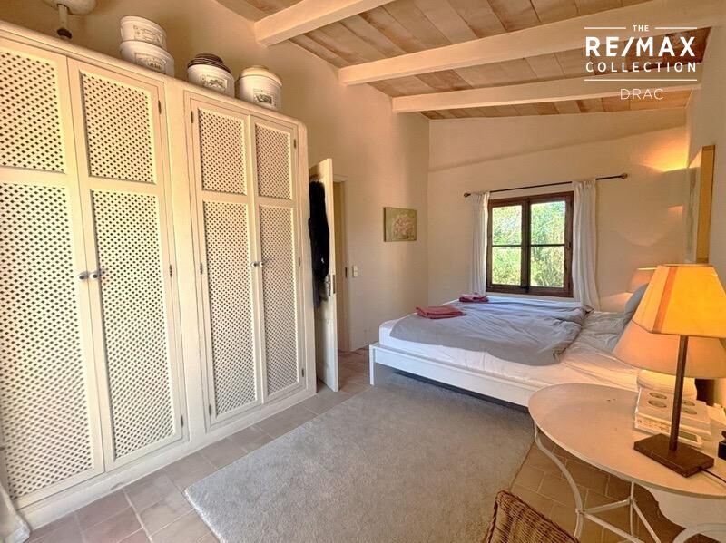 A l’interior, la casa compta amb un lluminós saló-menjador amb llar de foc de llenya i aire condicionat (fred-calor). La lluminosa cuina americana ha estat recentment reformada i inclou frigorífic, placa de gas, forn i rentavaixelles. El bany amb dutxa també ha estat recentment reformat. Hi ha dos dormitoris, un amb un ampli armari encastat.