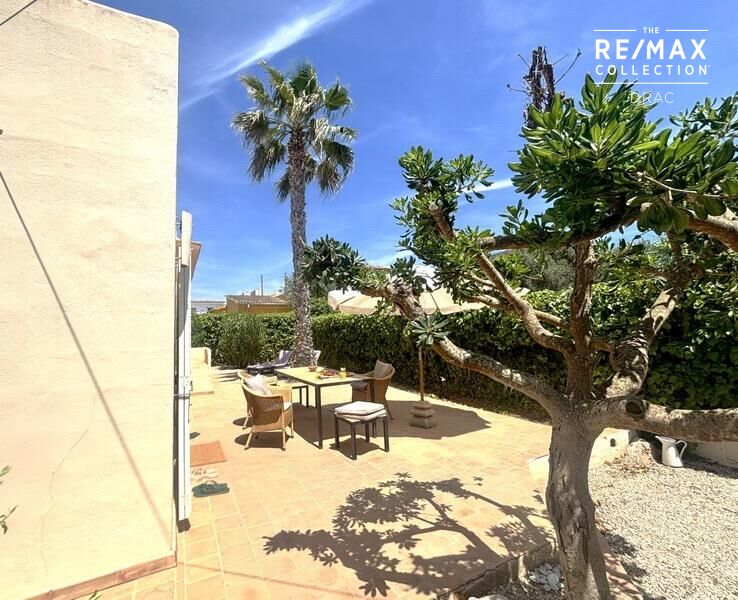 A l’exterior, compta amb una terrassa coberta a l’entrada i una àmplia i assolellada terrassa a la part del darrere, moblada amb gandules, taula de menjador, taula de ping-pong, cuina exterior amb placa de gas i dutxa exterior. També hi ha un traster petit i un terrat amb vista panoràmica sobre el mar.