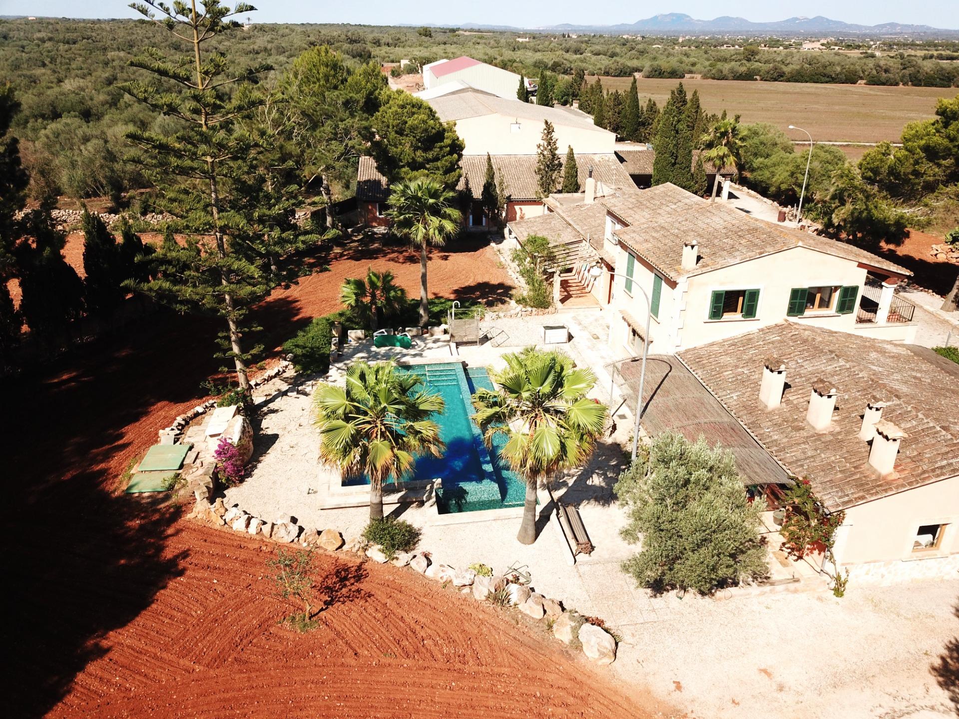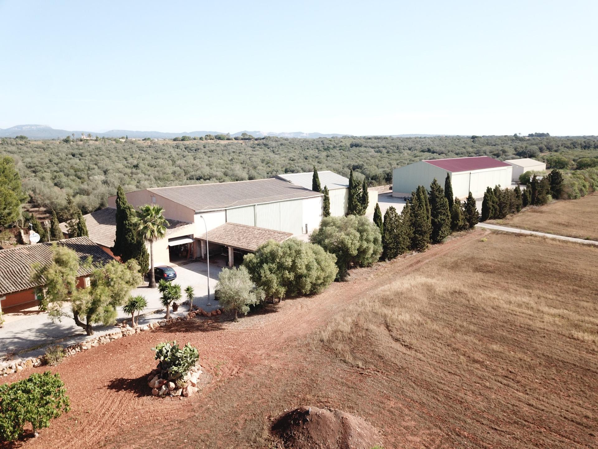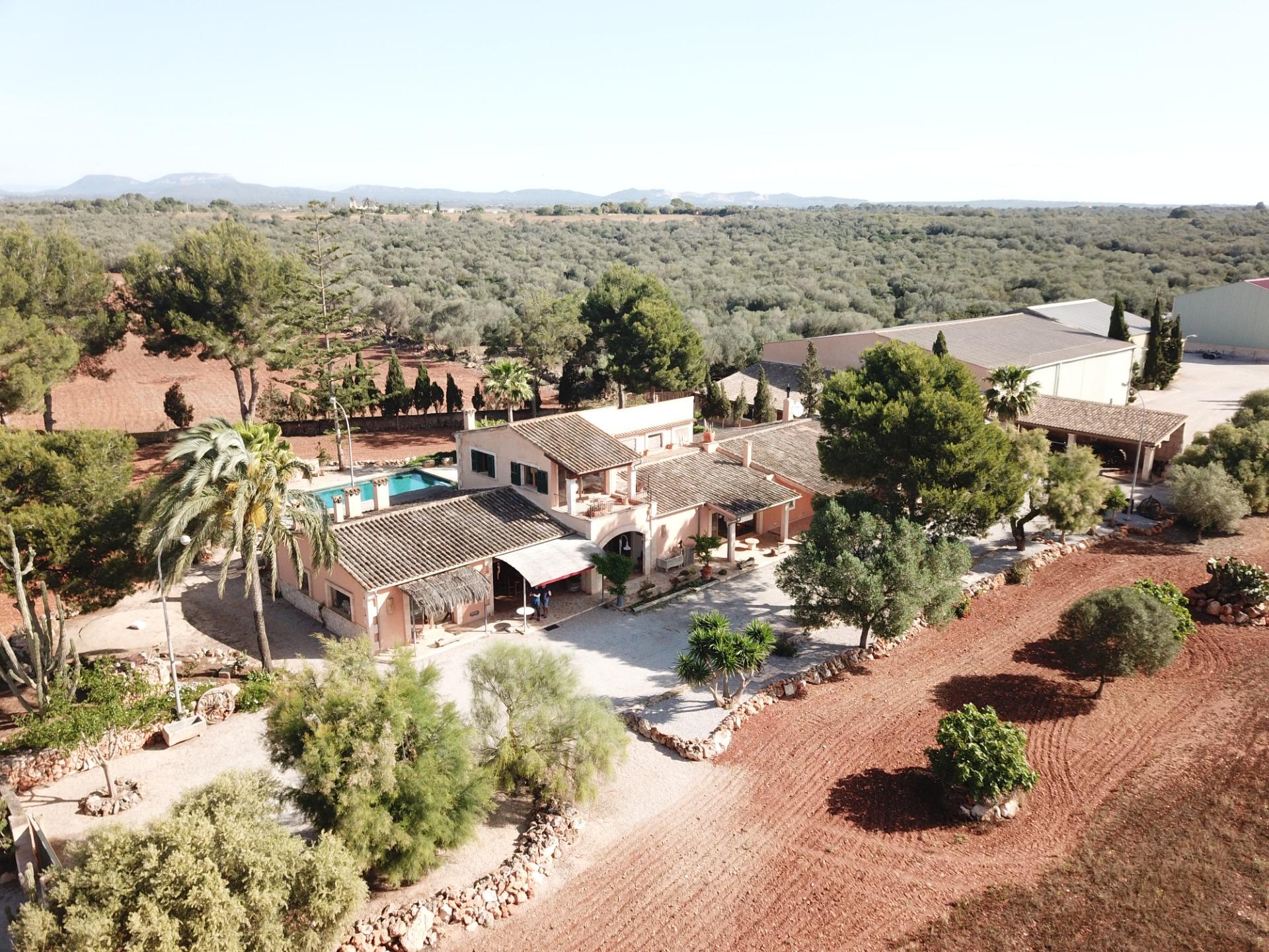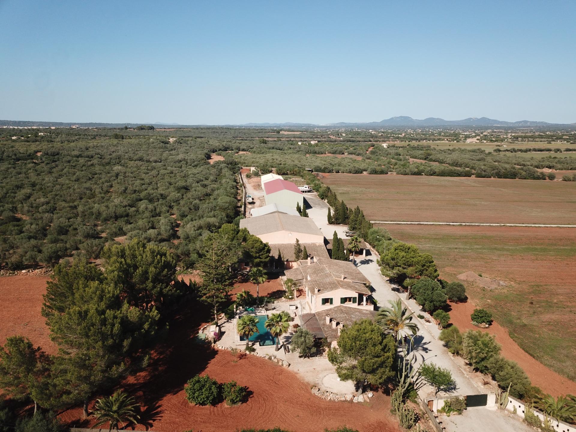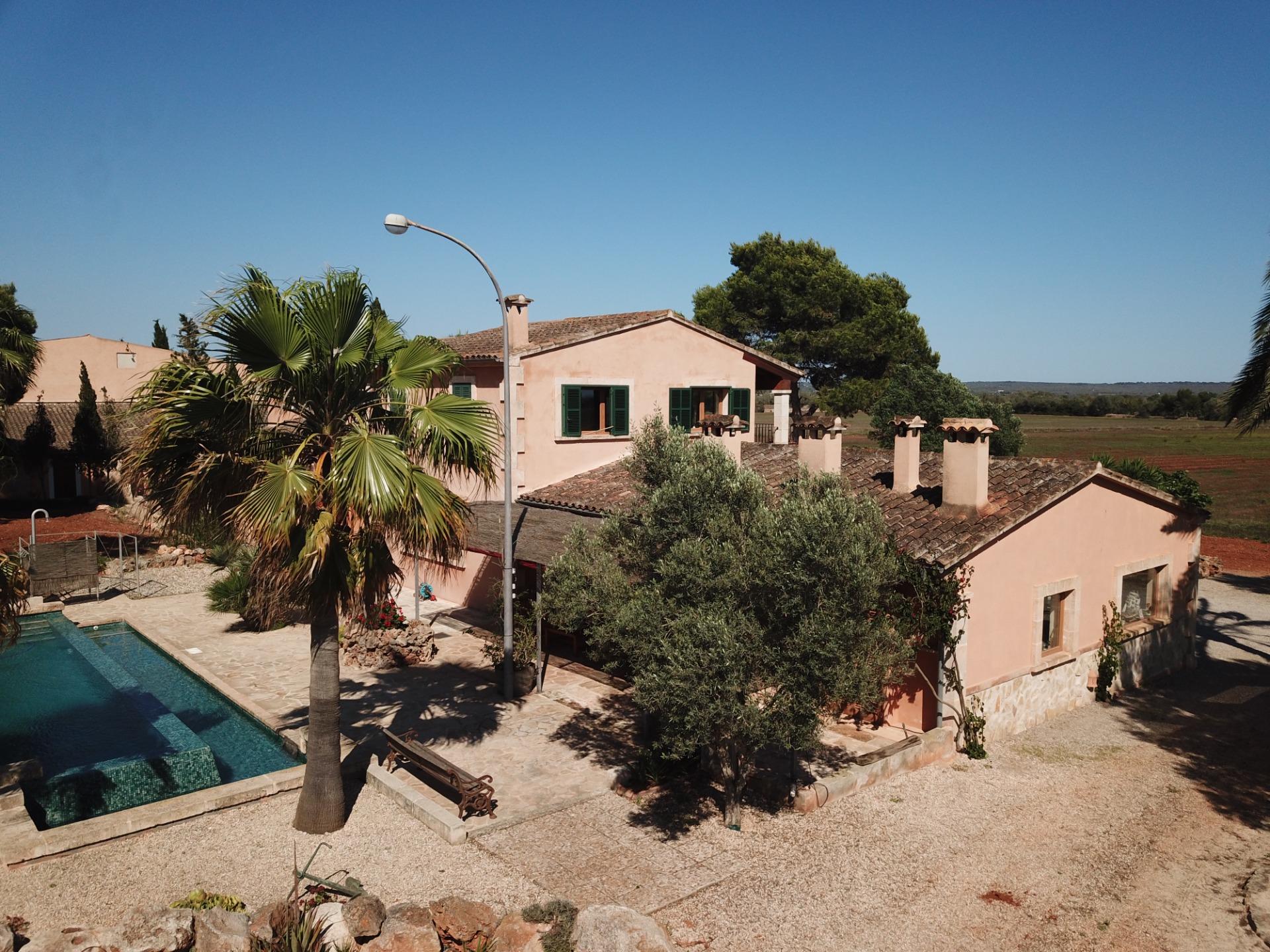 Aquesta gran finca rústica de 86.000 m2 de terreny, es troba a pocs quilòmetres de la platja des Trenc, en un emplaçament rural molt tranquil, però no gaire lluny de zones urbanes com sa Ràpida o Camps i a mitja hora de l’aeroport. La finca té moltes possibilitats, a més d’un gran habitatge d’uns 600 m2 amb piscina , amb un gran garatge i un magatzem agrícola, compta amb tres naus industrials de grans proporcions, on abans es guardaven vaixells i que es podrien destinar a altres funcions, a més de la piscina compta amb un “safareig” que és un estany d’aigua emmagatzemada per al regadiu.L’habitatge és ideal per a una gran família, té unes àmplies zones comunes com una gran sala menjador que es comunica amb la piscina i que pot estar oberta a l’estiu i vidrada a l’hivern, una gran cuina amb totes les comoditats, incloent-hi un gran forn . un despatx i una gran sala d’estar, tot molt lluminós i enlairat. a la primera planta hi ha un gran dormitori doble amb vestidor , bany i una terrassa des d’on es pot veure el mar i l’illa de Cabrera. a la planta baixa es troben les altres habitacions i banys.La casa disposa de calefacció central, en algunes parts radiadores, i en altres sòl radiant, la piscina té un Jakuzy i també un generador d’onades. La finca està connectada a la xarxa elèctrica i a l’ aigua corrent i a més té dos pous d’ aigua subterranis i una gran extensió de terra de conreu.