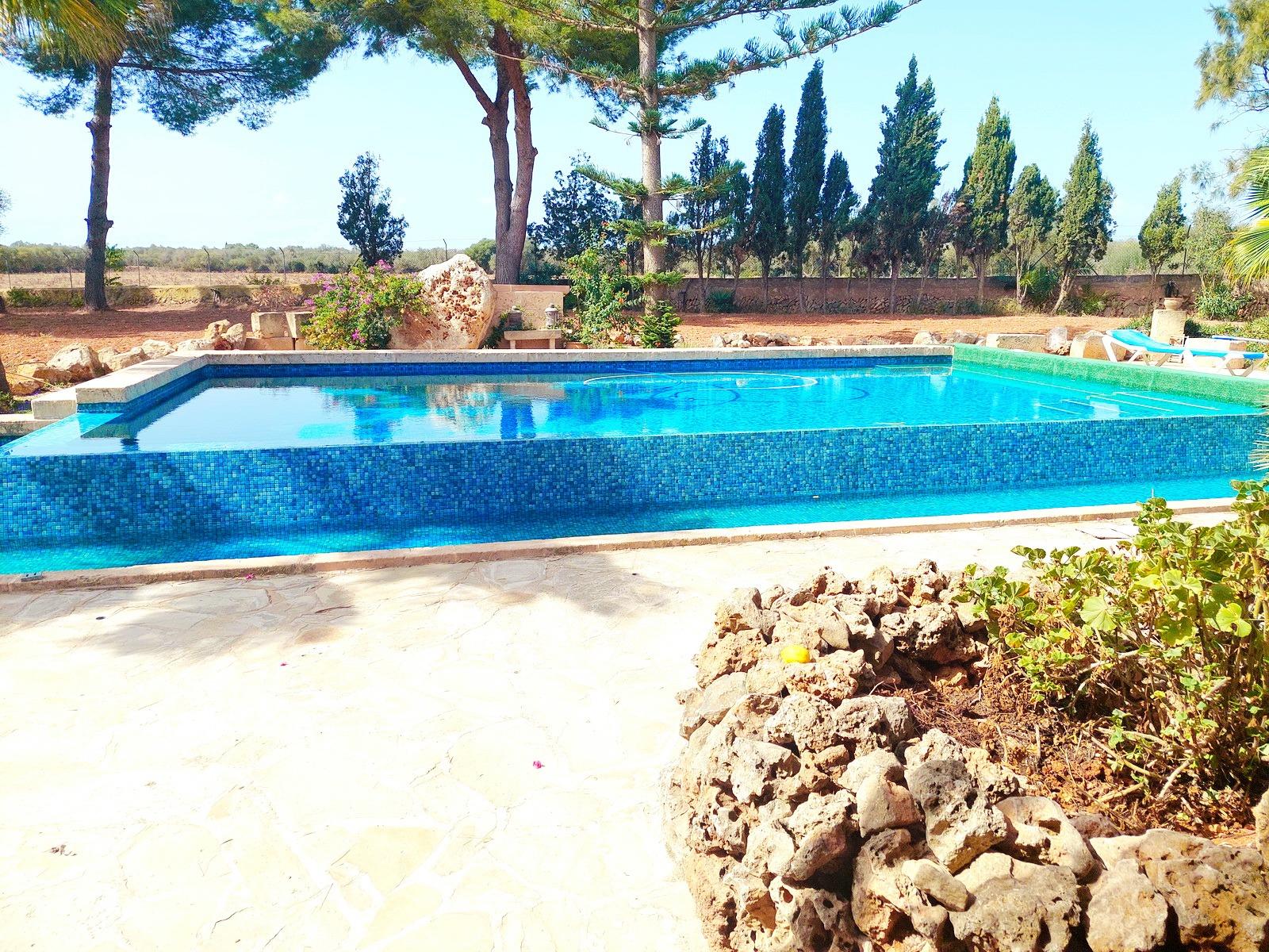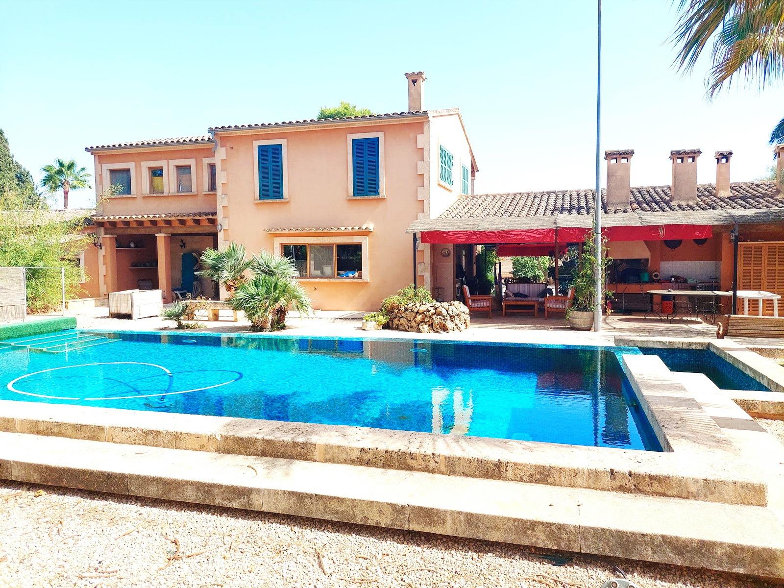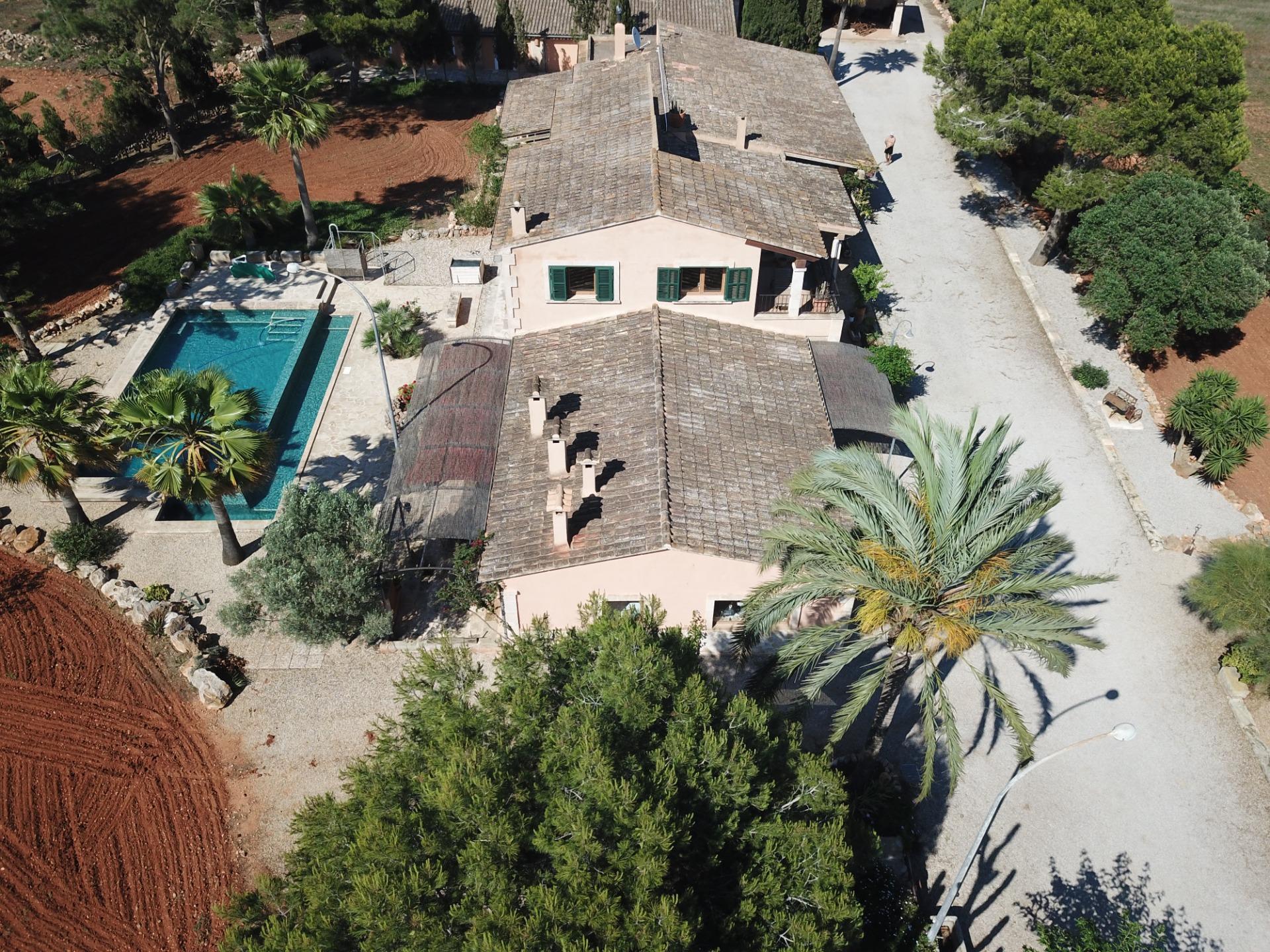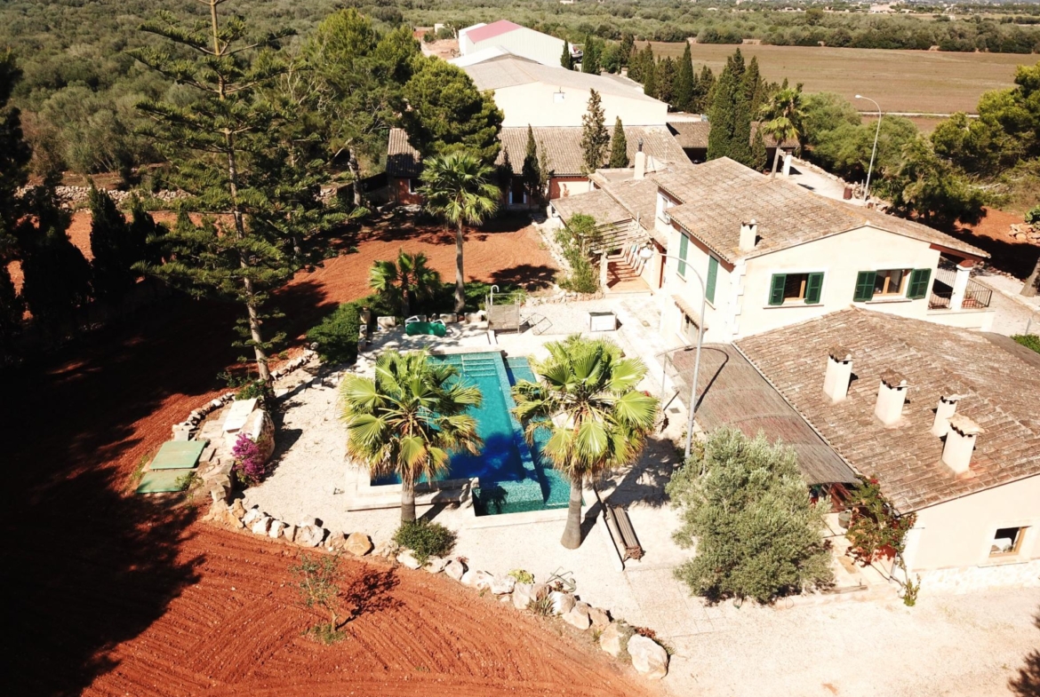 Aquesta gran finca rústica de 86.000 m2 de terreny, es troba a pocs quilòmetres de la platja des Trenc, en un emplaçament rural molt tranquil, però no gaire lluny de zones urbanes com sa Ràpida o Camps i a mitja hora de l’aeroport. La finca té moltes possibilitats, a més d’un gran habitatge d’uns 600 m2 amb piscina , amb un gran garatge i un magatzem agrícola, compta amb tres naus industrials de grans proporcions, on abans es guardaven vaixells i que es podrien destinar a altres funcions, a més de la piscina compta amb un “safareig” que és un estany d’aigua emmagatzemada per al regadiu.L’habitatge és ideal per a una gran família, té unes àmplies zones comunes com una gran sala menjador que es comunica amb la piscina i que pot estar oberta a l’estiu i vidrada a l’hivern, una gran cuina amb totes les comoditats, incloent-hi un gran forn . un despatx i una gran sala d’estar, tot molt lluminós i enlairat. a la primera planta hi ha un gran dormitori doble amb vestidor , bany i una terrassa des d’on es pot veure el mar i l’illa de Cabrera. a la planta baixa es troben les altres habitacions i banys.La casa disposa de calefacció central, en algunes parts radiadores, i en altres sòl radiant, la piscina té un Jakuzy i també un generador d’onades. La finca està connectada a la xarxa elèctrica i a l’ aigua corrent i a més té dos pous d’ aigua subterranis i una gran extensió de terra de conreu.