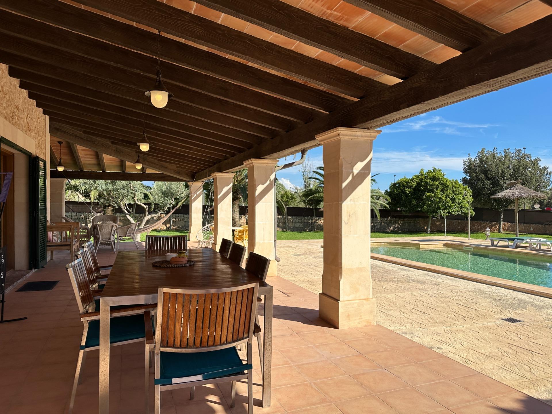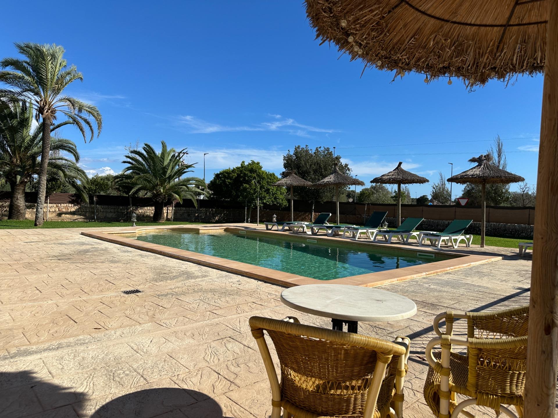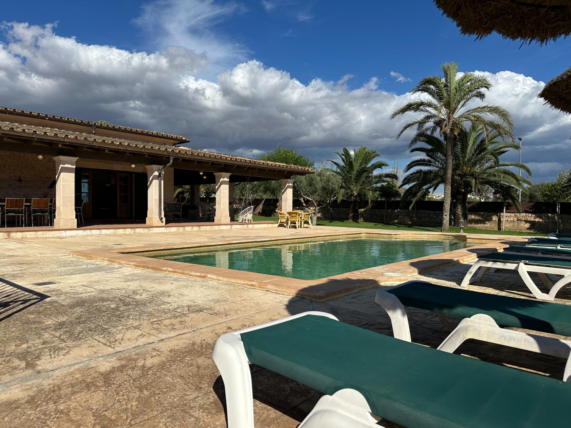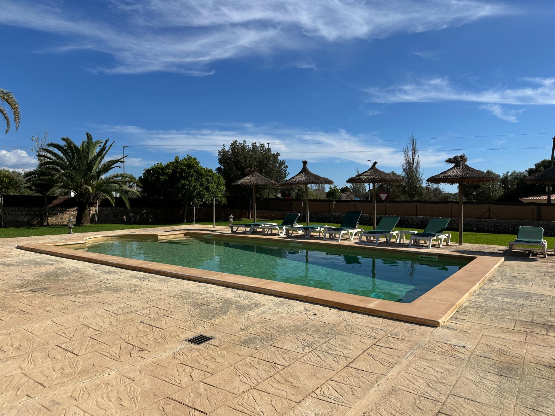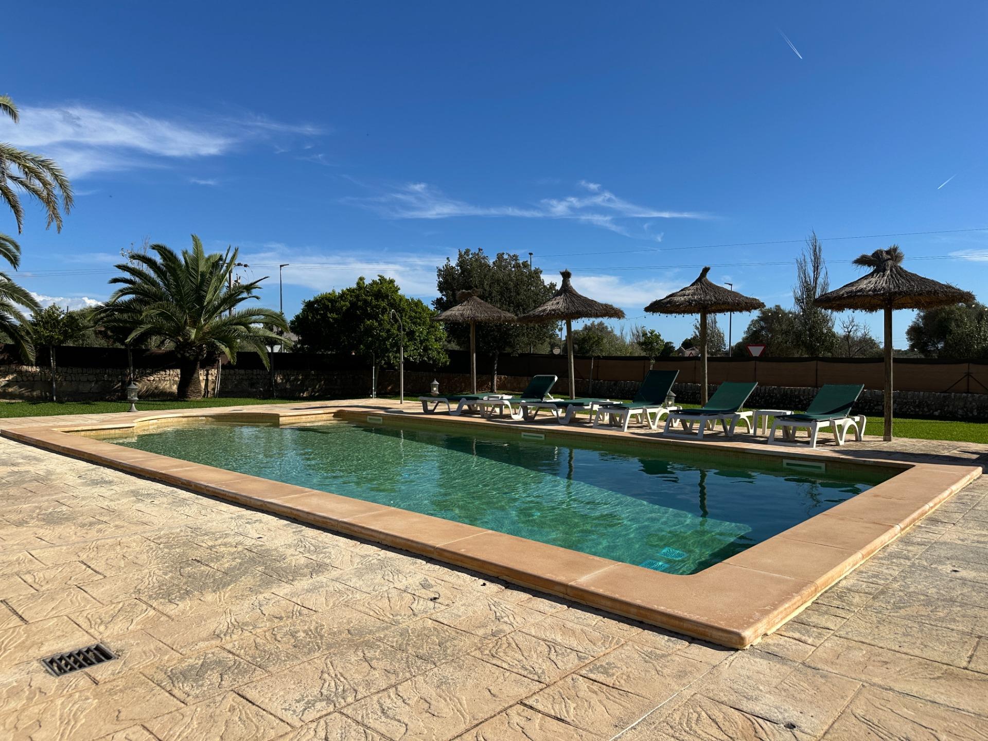 The exterior is, without doubt, the soul of the finca. Spacious terraces, a covered porch with an outdoor dining area, sun loungers and a barbecue create an outdoor living space truly designed for relaxation and enjoyment in good company. All of this is set within a landscaped garden that frames a 10 x 4 m saltwater pool with hydromassage, ideal for the long, sun-drenched Mallorcan summers. The property also includes a garage for 2 vehicles and a separate storage room.