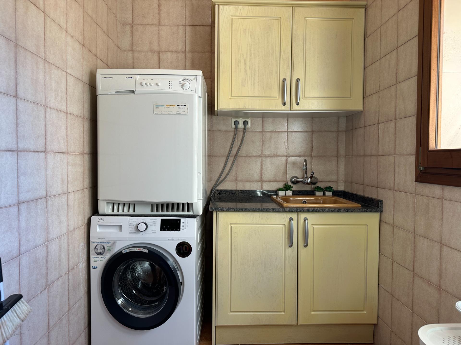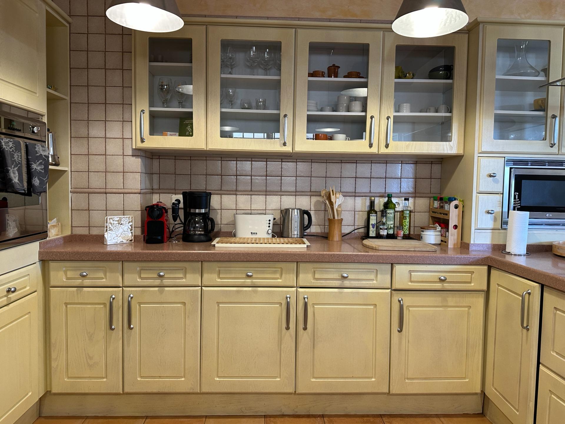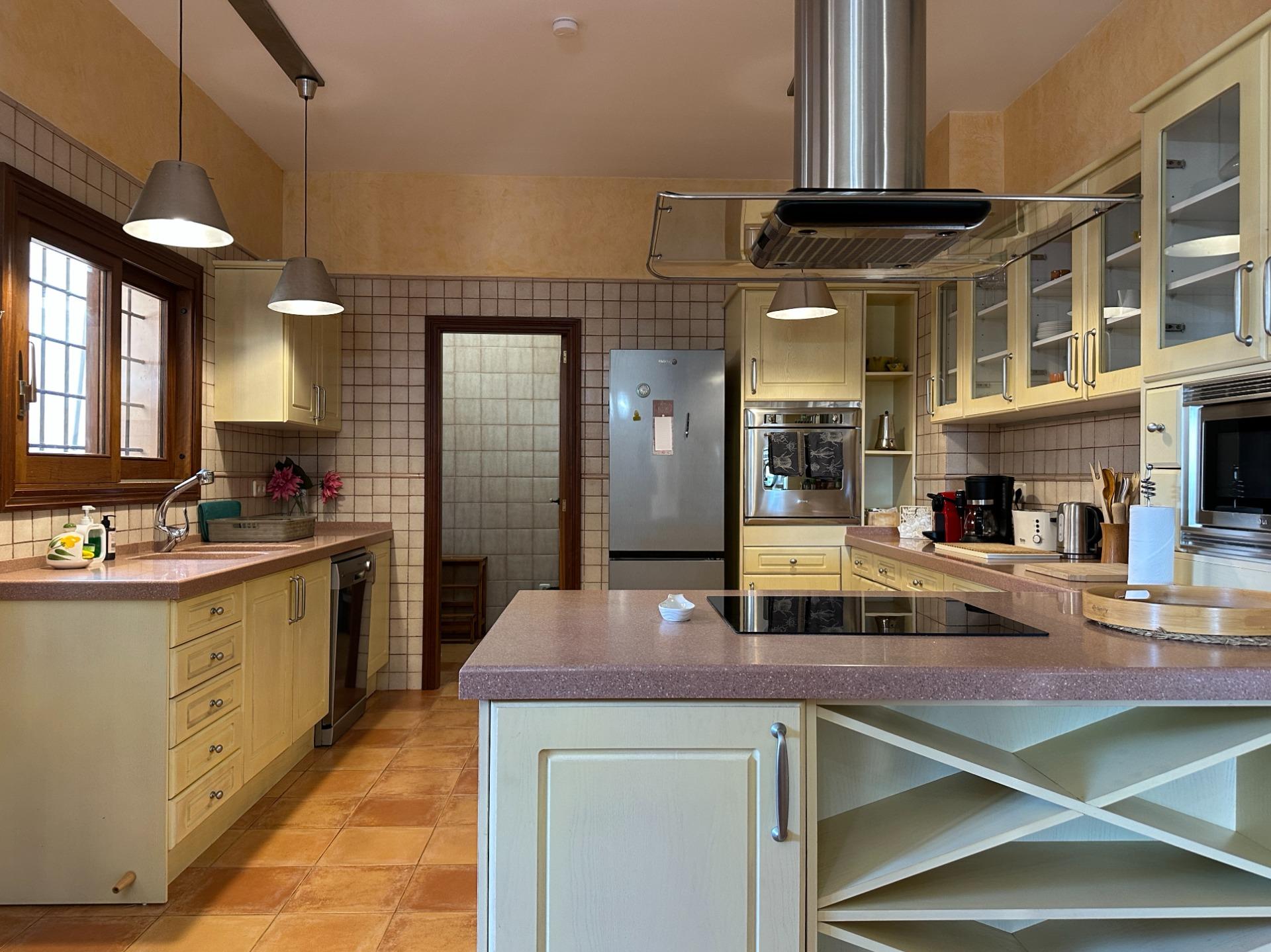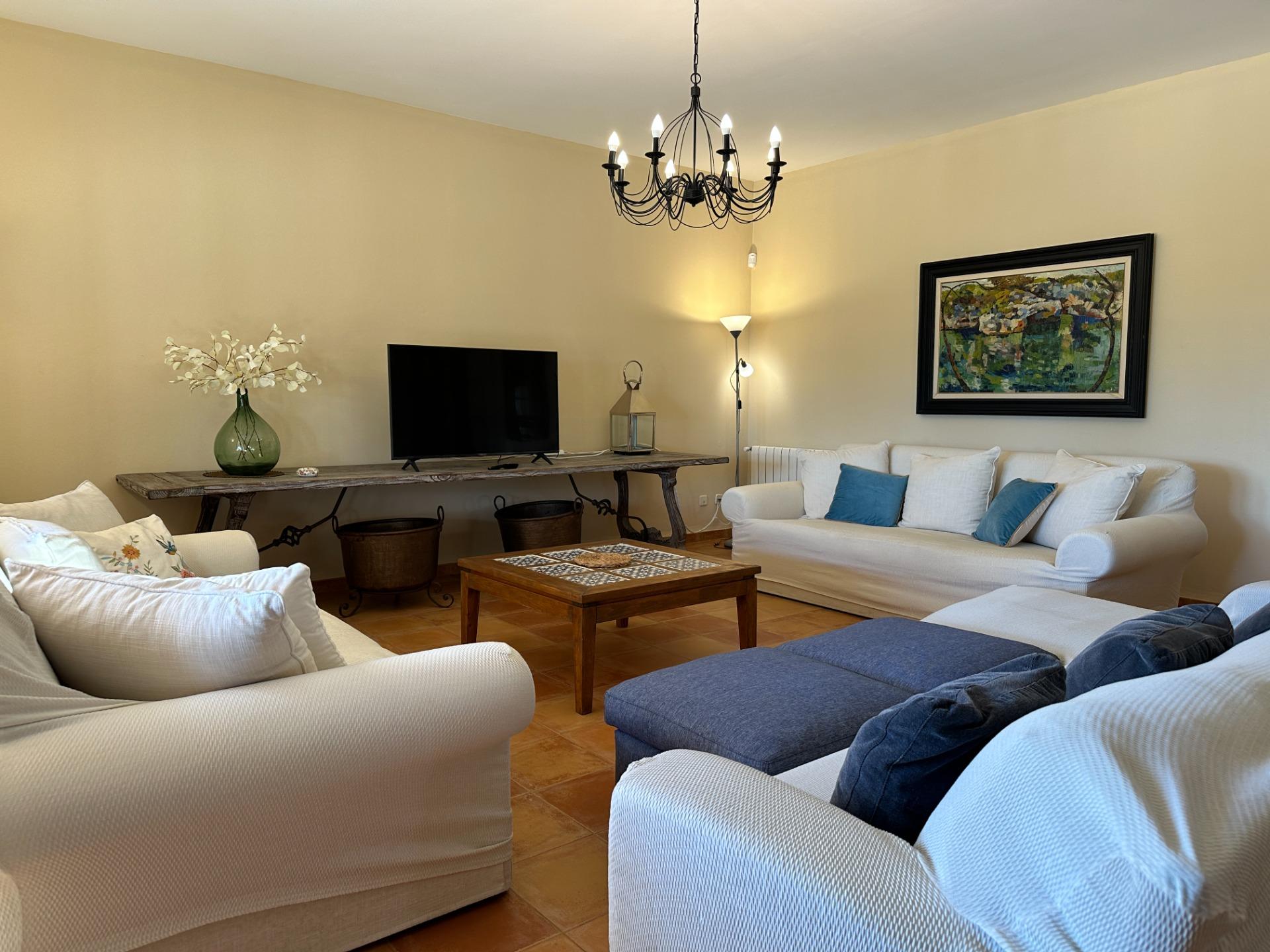 On the ground floor, the generous open-plan living and dining room is flooded with natural light, creating a warm and welcoming atmosphere perfect for long Mediterranean evenings. The fully equipped kitchen complements this space with everything needed to make every stay a truly effortless experience.