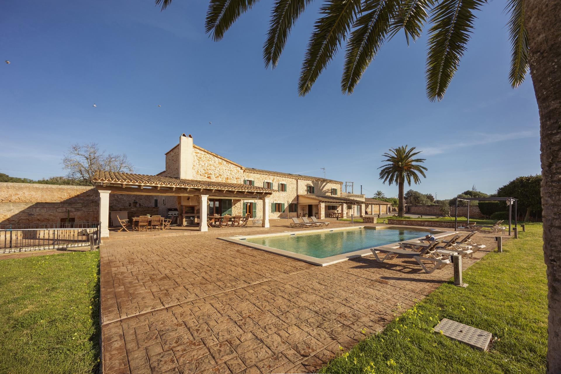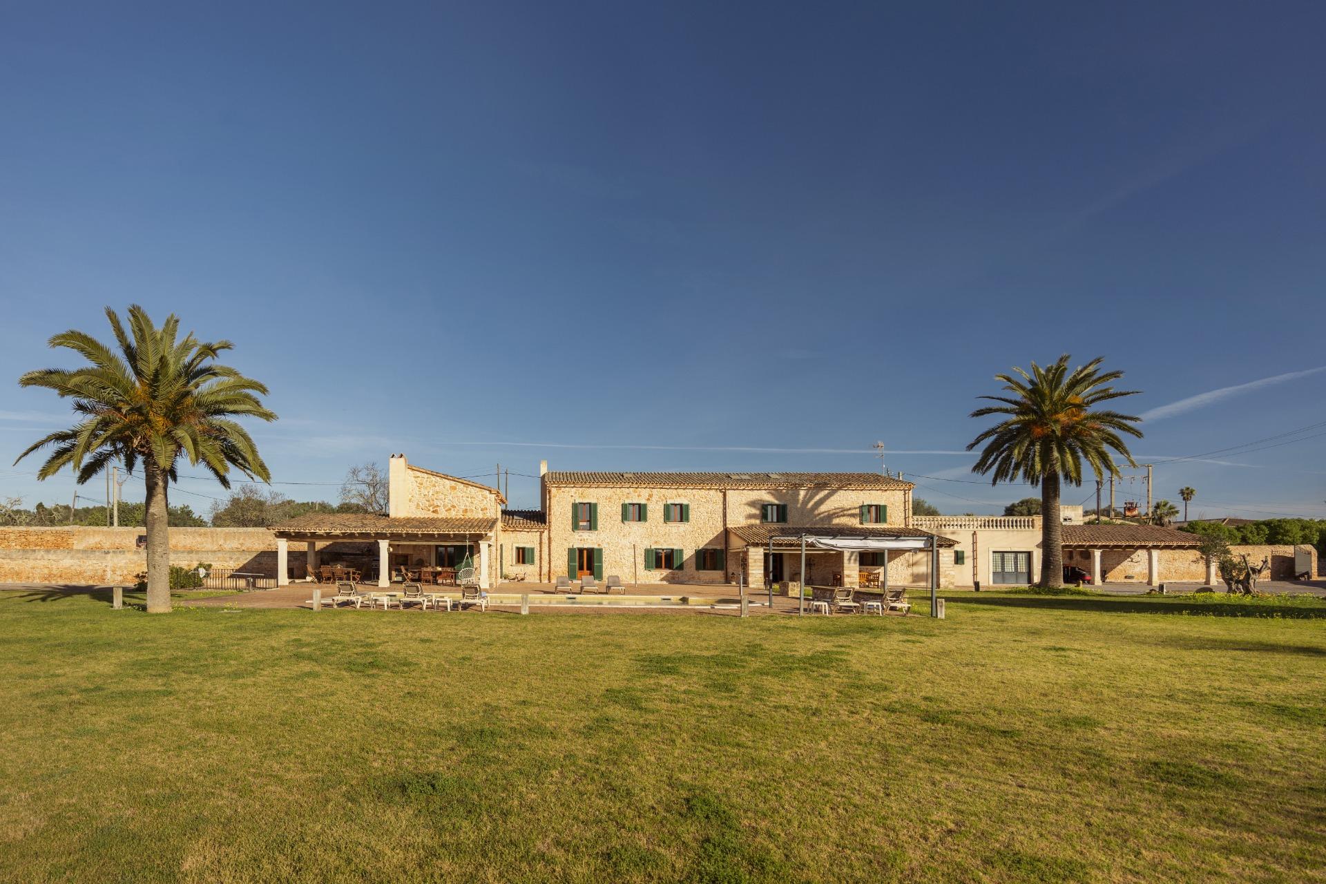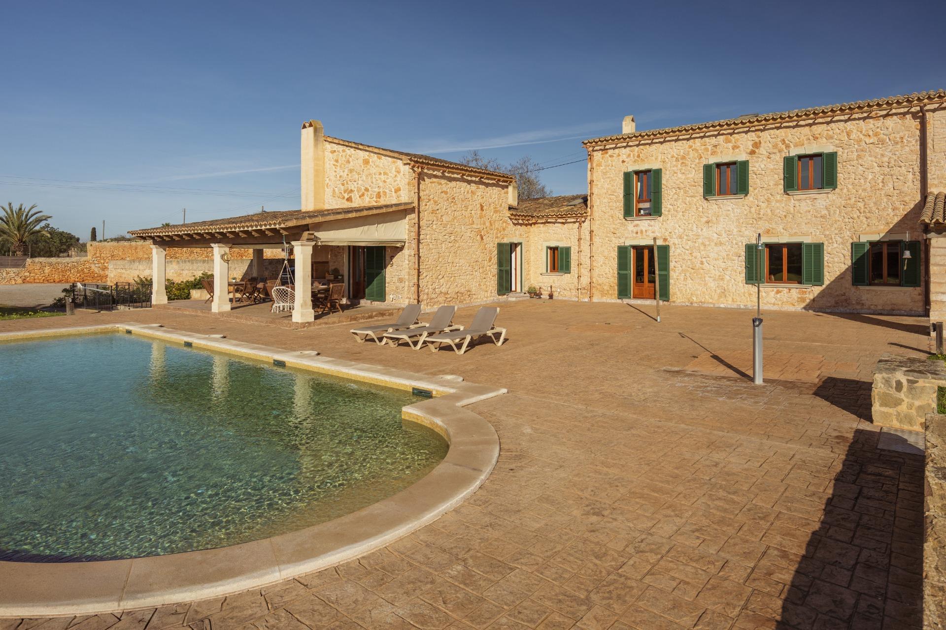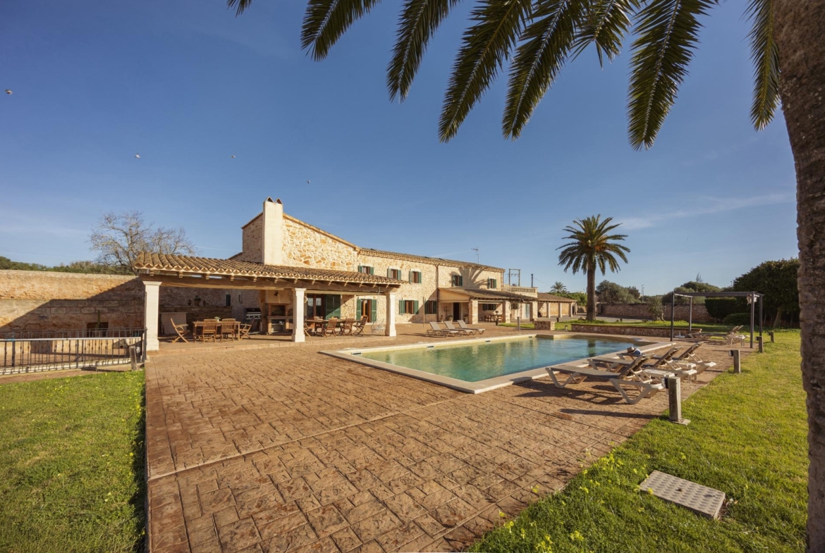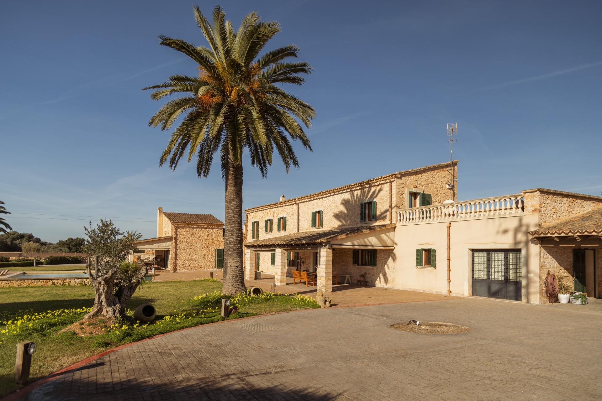La casa es de arquitectura tradicional mallorquina, está situada en las afueras del pueblo en un terreno de 26.618 m2. Consta de una vivienda unifamiliar aislada con piscina, con una superficie en dos plantas de 517m2, piscina de 82 m2 de espejo de agua, 520 m2 de terrazas. Paredes interiores y exteriores de piedra. La cocina y el salón comedor se encuentran en la planta baja, dispone de 1 habitación doble con baño en la planta baja y tres habitaciones dobles, una con baño en suite y las otras dos con baño compartido ,en la primera planta. En la planta baja también tiene un baño extra para invitados.Porches 161 m2Zona jardín con 1.800 m2 de césped. Sala de máquinas subterránea 55 m2.