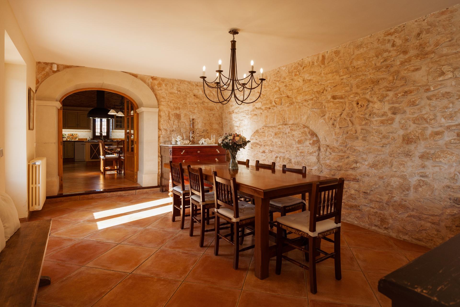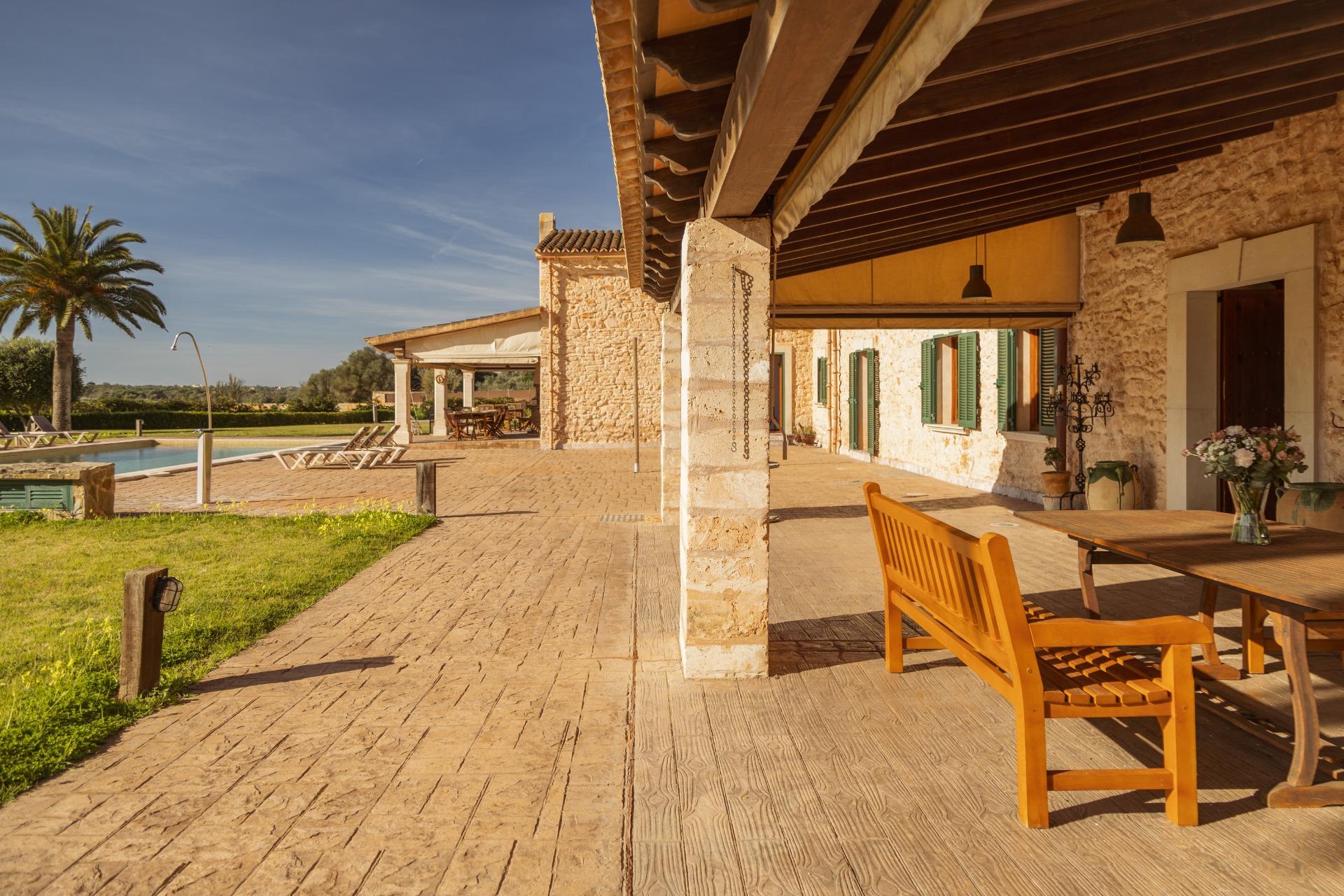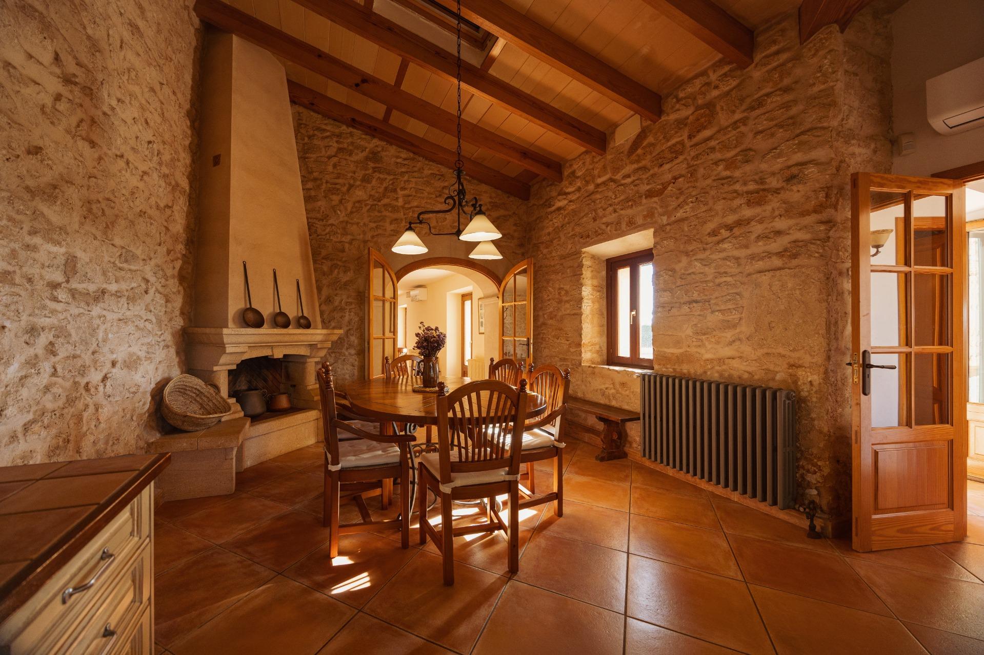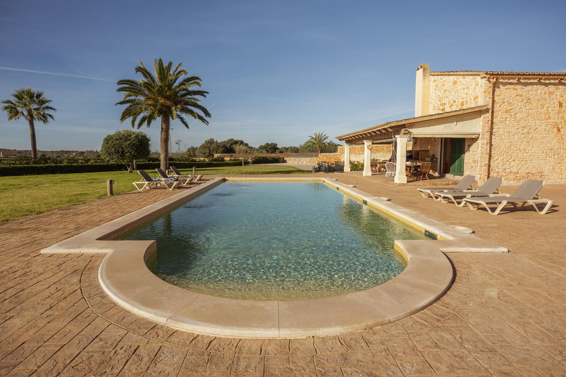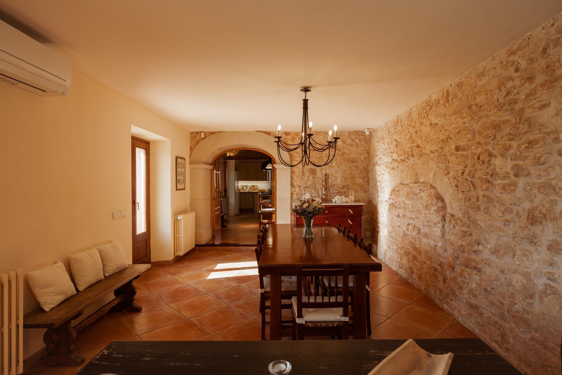 La casa es de arquitectura tradicional mallorquina, está situada en las afueras del pueblo en un terreno de 26.618 m2. Consta de una vivienda unifamiliar aislada con piscina, con una superficie en dos plantas de 517m2, piscina de 82 m2 de espejo de agua, 520 m2 de terrazas. Paredes interiores y exteriores de piedra. La cocina y el salón comedor se encuentran en la planta baja, dispone de 1 habitación doble con baño en la planta baja y tres habitaciones dobles, una con baño en suite y las otras dos con baño compartido ,en la primera planta. En la planta baja también tiene un baño extra para invitados.Porches 161 m2Zona jardín con 1.800 m2 de césped. Sala de máquinas subterránea 55 m2.