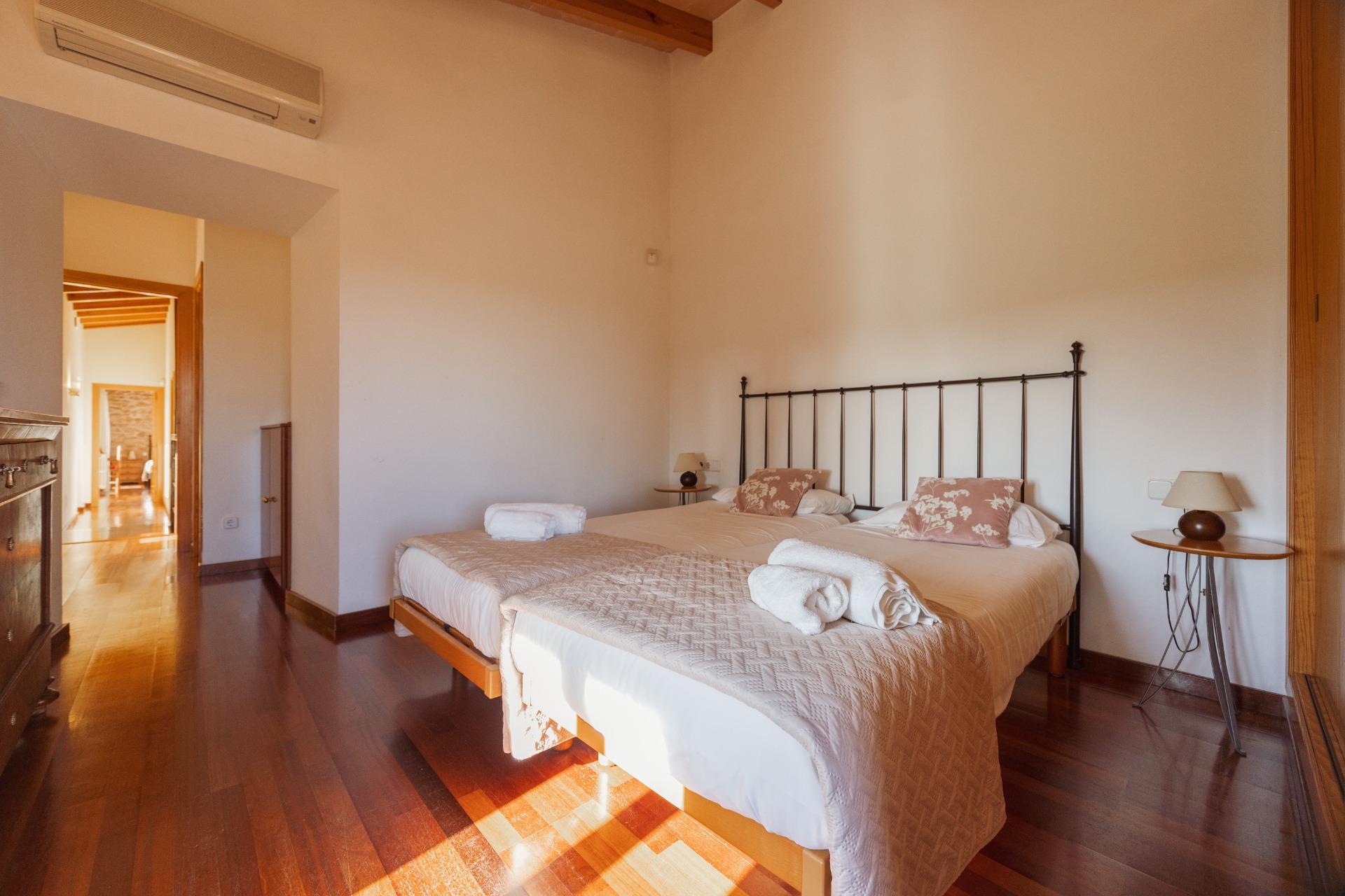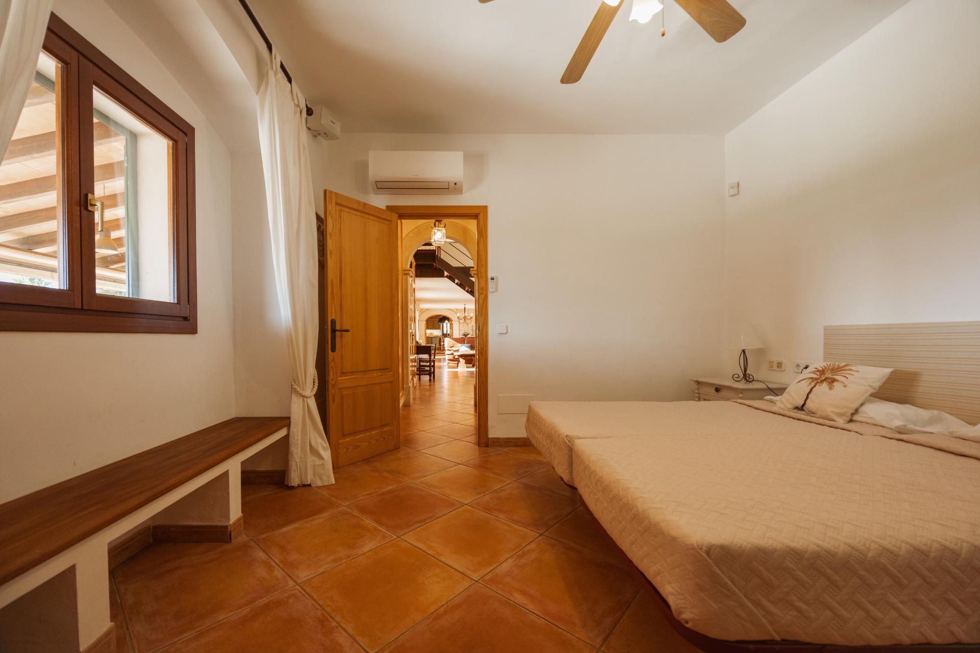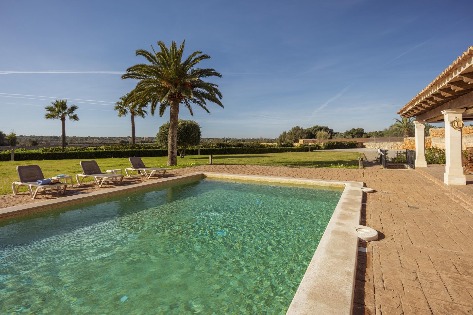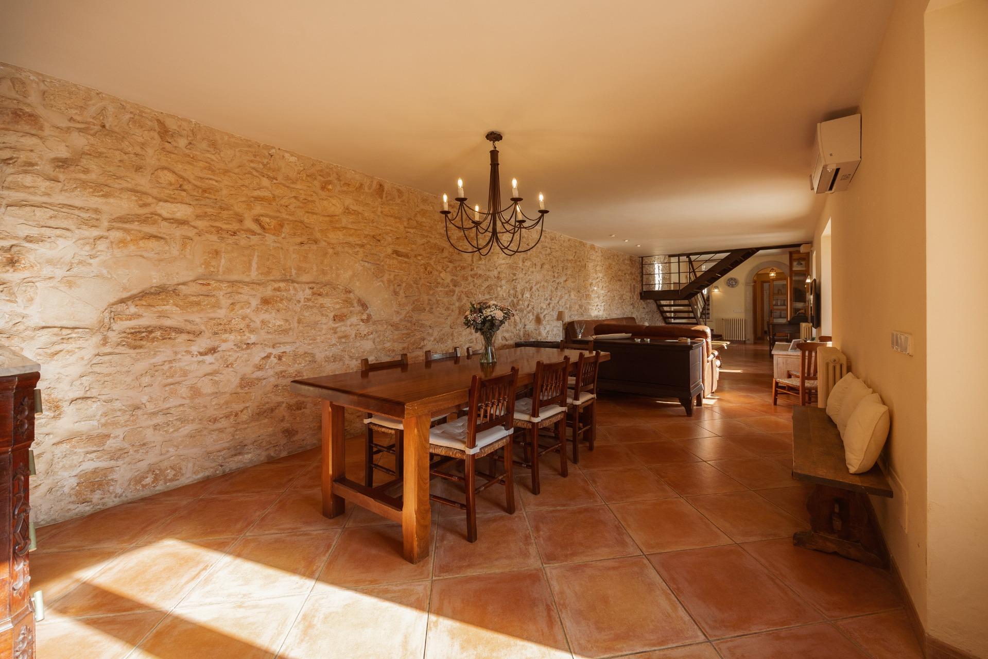 La casa es de arquitectura tradicional mallorquina, está situada en las afueras del pueblo en un terreno de 26.618 m2. Consta de una vivienda unifamiliar aislada con piscina, con una superficie en dos plantas de 517m2, piscina de 82 m2 de espejo de agua, 520 m2 de terrazas. Paredes interiores y exteriores de piedra. La cocina y el salón comedor se encuentran en la planta baja, dispone de 1 habitación doble con baño en la planta baja y tres habitaciones dobles, una con baño en suite y las otras dos con baño compartido ,en la primera planta. En la planta baja también tiene un baño extra para invitados.Porches 161 m2Zona jardín con 1.800 m2 de césped. Sala de máquinas subterránea 55 m2.